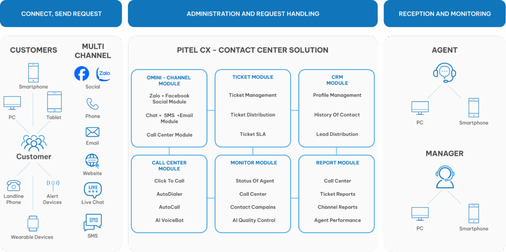 Receive requests and process them using PiTEL CX’s dedicated modules